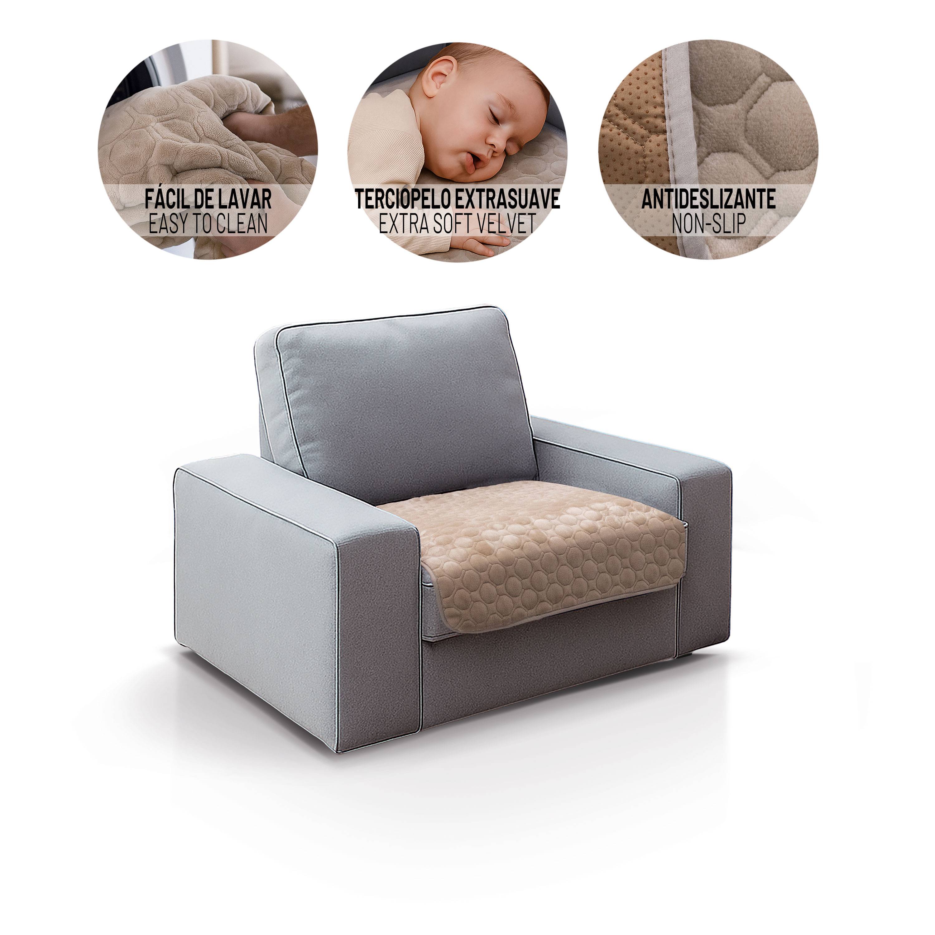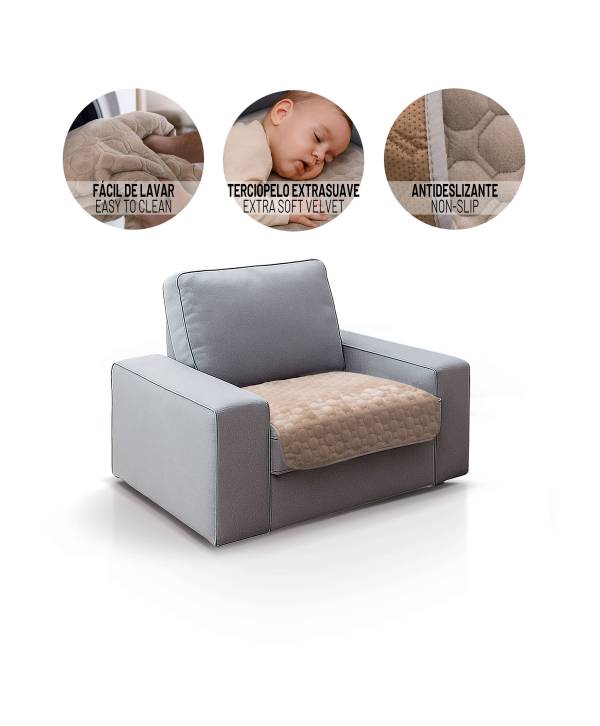 TOPPER MULTIUSOS ACOLCHADO tacto SUAVE con acabado ANTIMANCHAS y ANTIDESLIZANTE. Multiples usos súper prácticos como: Protección de sofá, Alfombra para juegos, Picnic, Colcha para cama, Cambiador para Bebés, alfombra para animales, ... Fabricada íntegramente en España por el fabricante líder en el sector de la protección de sofás: SOFACAMALEON. Tejido efecto PELUCHE extra SUAVE. Acabado antideslizante por su parte inferior para que quede fijo en cualquier superficie donde se coloque. Acabado ANTI-MANCHAS para su fácil lavado. Disponible en varias medidas. Excelente calidad por su tejido y su confección. Tejido con hilo tintado para conseguir una máxima solidez de color frente al lavado. Fácil y rápida colocación. Alarga la vida de tu sofá protegiéndolo de manchas, restos de comida, pelos de mascotas, ácaros, etc. Certificados OEKOTEX de ausencia de sustancias nocivas y GRS de utilización de fibras recicladas.